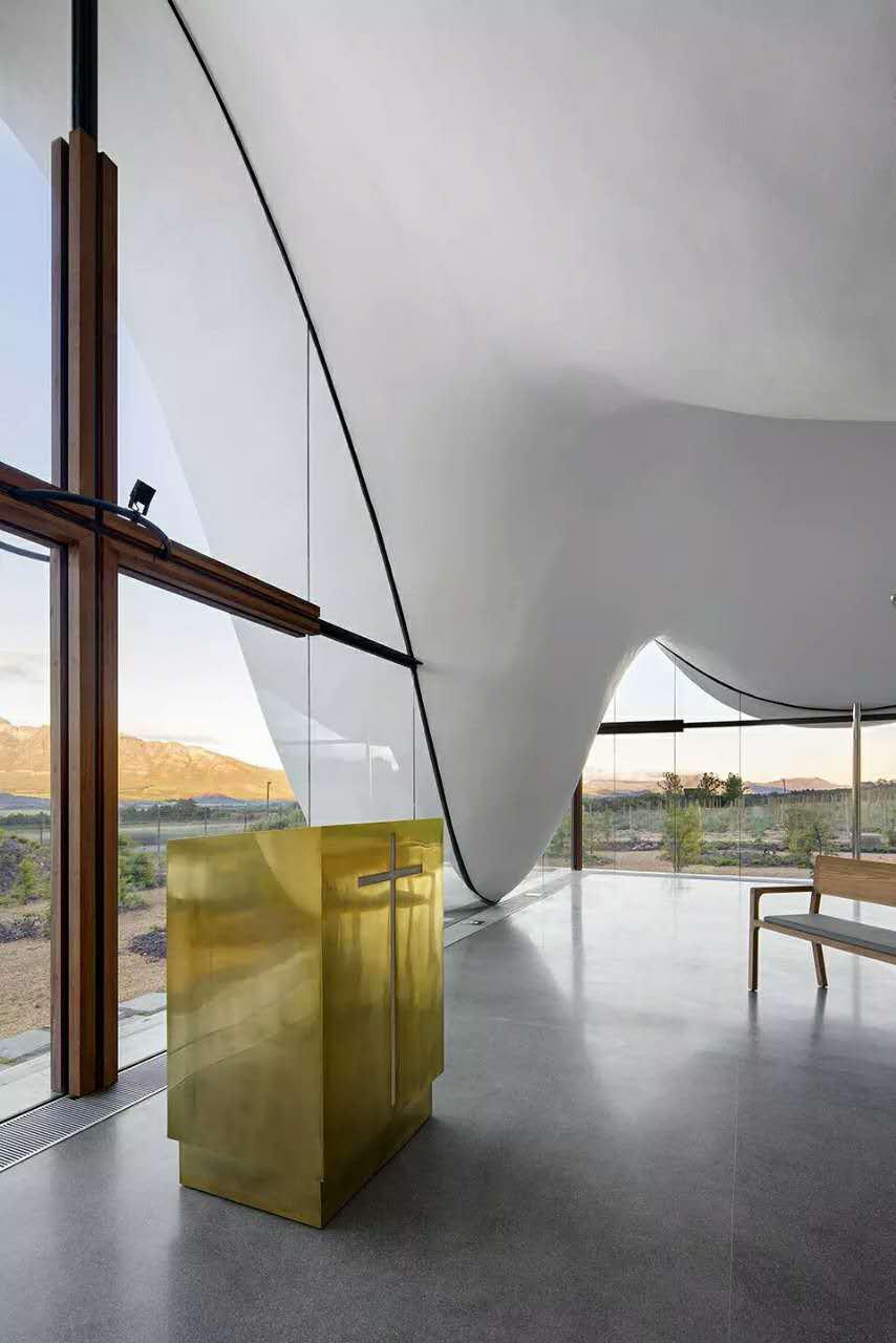 這座小教堂由Steyn Studio事務(wù)所中一位南非裔設(shè)計(jì)師Coetzee Steyn主持設(shè)計(jì)。它位于南非一處葡萄園中,其寧?kù)o如雕塑般的外形模仿周圍群山的輪廓幅度,其悅動(dòng)的造型仿佛向西開(kāi)普敦的鄉(xiāng)村歷史風(fēng)光致敬。