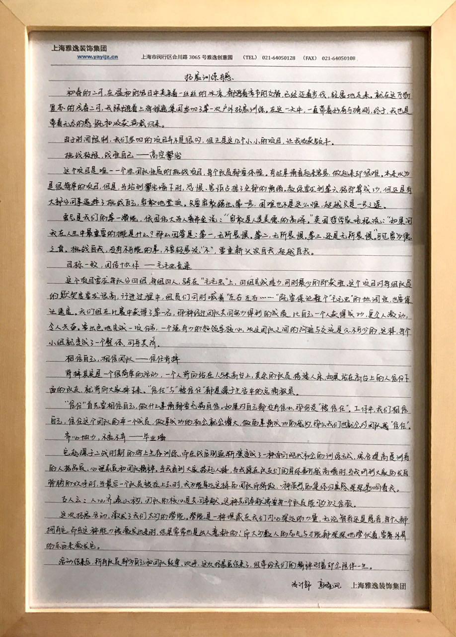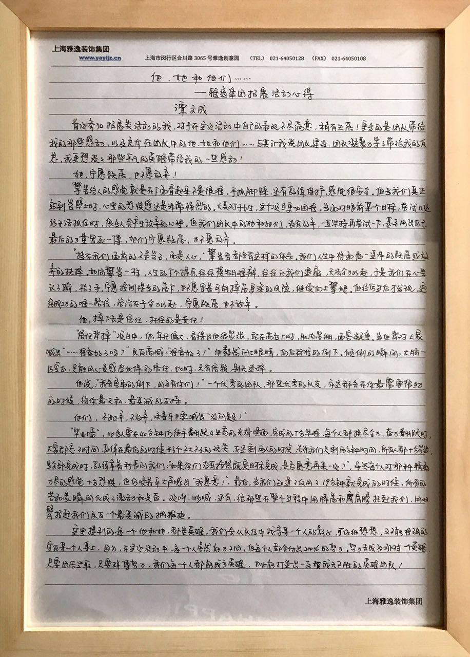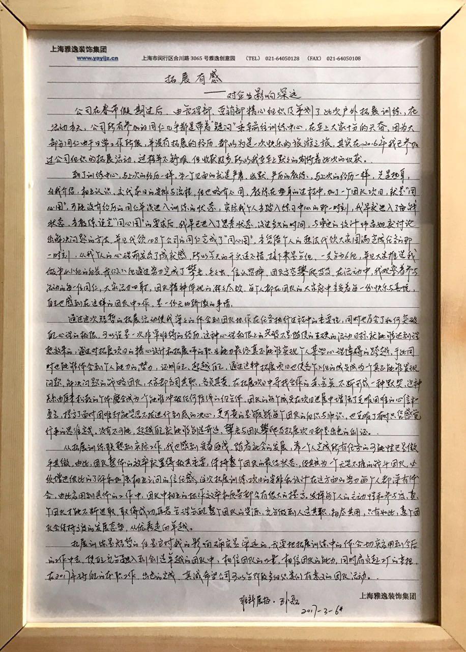 趁著這股熱潮,2017年3月6日,公司內(nèi)部舉辦了“拓展活動(dòng)心得征文比賽”,為全體員工提供一個(gè)展現(xiàn)自我的平臺(tái)。公司評(píng)委小組從三十五份評(píng)選文章中投票選出六份獲獎(jiǎng)文章,以資鼓勵(lì),并在公司大堂舉辦獲獎(jiǎng)?wù)魑恼埂?/p>