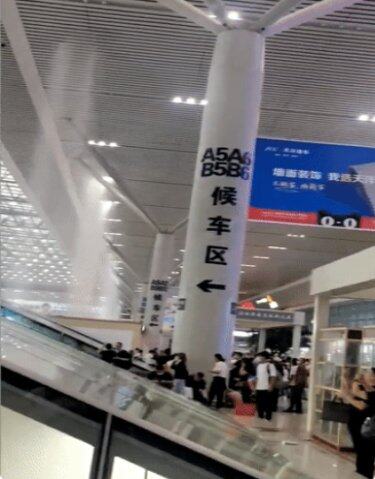 受暴雨影響,高鐵站候車區(qū)漏雨,鐵路列車停運(yùn)。